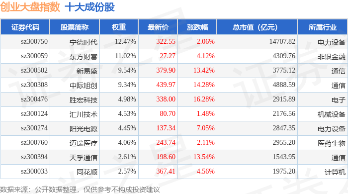 证券之星消息,9月11日,创业大盘(399293)指数报收于6244.58点,涨6.05%,成交2441.69亿元,换手率4.28%。当日该指数成份股中,上涨的有45家,胜宏科技以16.28%的涨幅领涨,下跌的有5家,泰格医药以4.67%的跌幅领跌。
