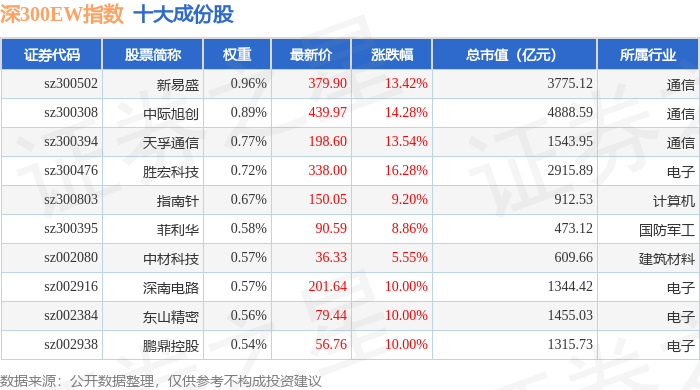 证券之星消息,9月11日,深300EW(399633)指数报收于5992.98点,涨2.96%,成交5923.78亿元,换手率2.2%。当日该指数成份股中,上涨的有261家,胜宏科技以16.28%的涨幅领涨,下跌的有33家,泰格医药以4.67%的跌幅领跌。