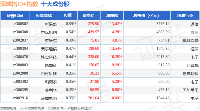 证券之星消息,9月11日,深成指EW(399659)指数报收于4510.45点,涨2.63%,成交7453.71亿元,换手率2.53%。当日该指数成份股中,上涨的有424家,香农芯创以20.0%的涨幅领涨,下跌的有66家,泰格医药以4.67%的跌幅领跌。