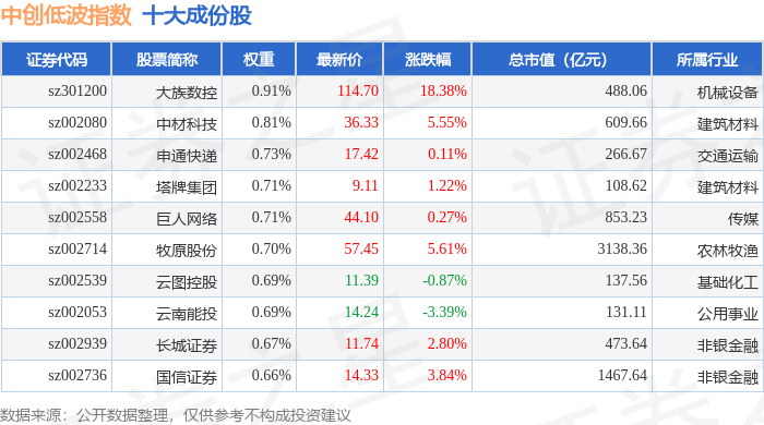 证券之星消息,9月11日,中创低波(399665)指数报收于2296.68点,涨1.78%,成交1606.04亿元,换手率1.93%。当日该指数成份股中,上涨的有162家,大族数控以18.38%的涨幅领涨,下跌的有34家,云南能投以3.39%的跌幅领跌。