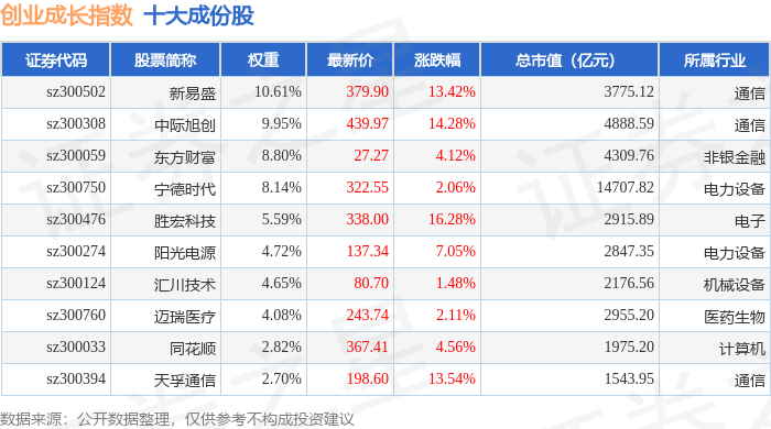 创业成长(399667)指数十大成份股详情如下: