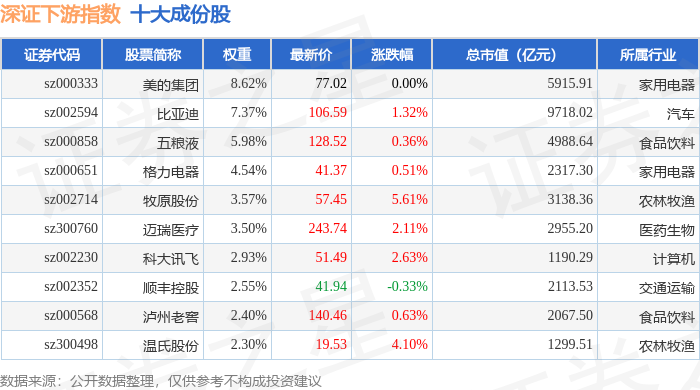 证券之星消息,9月11日,深证下游(399706)指数报收于6101.9点,涨1.63%,成交1449.96亿元,换手率2.47%。当日该指数成份股中,上涨的有74家,指南针以9.2%的涨幅领涨,下跌的有23家,泰格医药以4.67%的跌幅领跌。