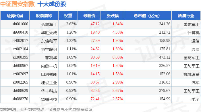 证券之星消息,9月11日,中证国安(399813)指数报收于7420.03点,涨2.66%,成交1245.54亿元,换手率3.28%。当日该指数成份股中,上涨的有147家,国博电子以16.51%的涨幅领涨,下跌的有5家,超图软件以1.28%的跌幅领跌。