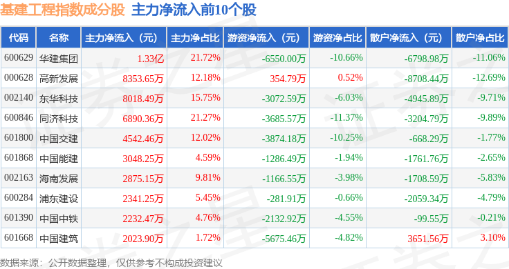 资金流向方面,基建工程(399995)指数成份股当日主力资金净流入合计2.97亿元,游资资金净流出合计3.48亿元,散户资金净流入合计5087.38万元。成份股资金流向详情见下表: