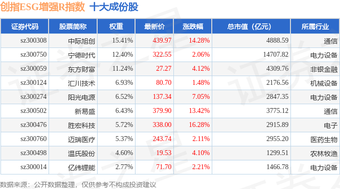 创指ESG增强R(470034)指数十大成份股详情如下: