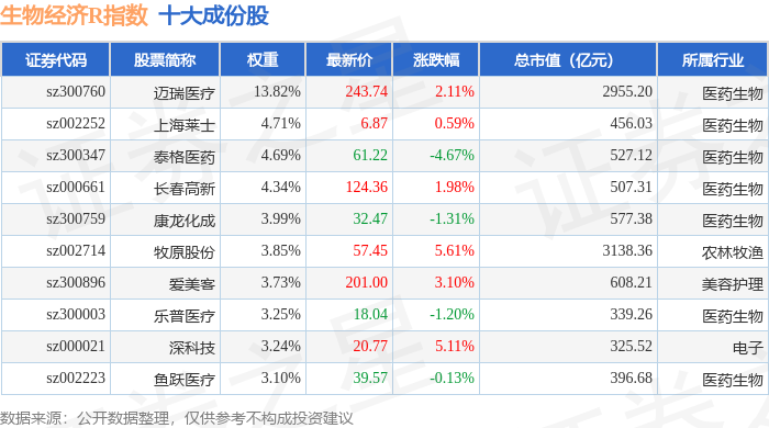 证券之星消息,9月11日,生物经济R(470038)指数报收于2682.71点,涨1.21%,成交396.41亿元,换手率2.74%。当日该指数成份股中,上涨的有36家,天康生物以9.94%的涨幅领涨,下跌的有14家,泰格医药以4.67%的跌幅领跌。