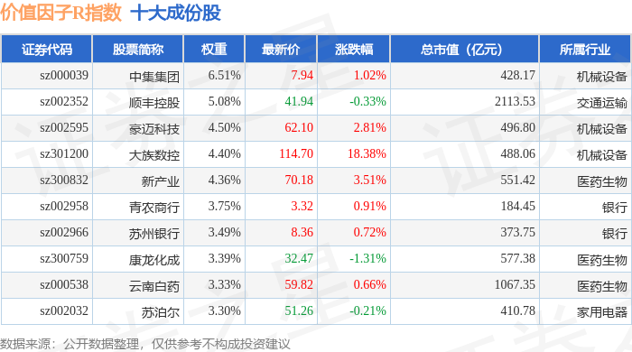 证券之星消息,9月11日,价值因子R(480056)指数报收于3115.03点,涨2.12%,成交505.34亿元,换手率1.42%。当日该指数成份股中,上涨的有39家,大族数控以18.38%的涨幅领涨,下跌的有9家,康龙化成以1.31%的跌幅领跌。