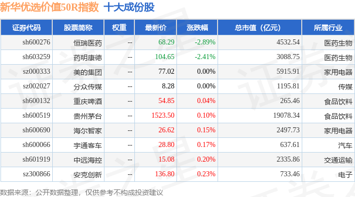 新华优选价值50R(489004)指数十大成份股详情如下: