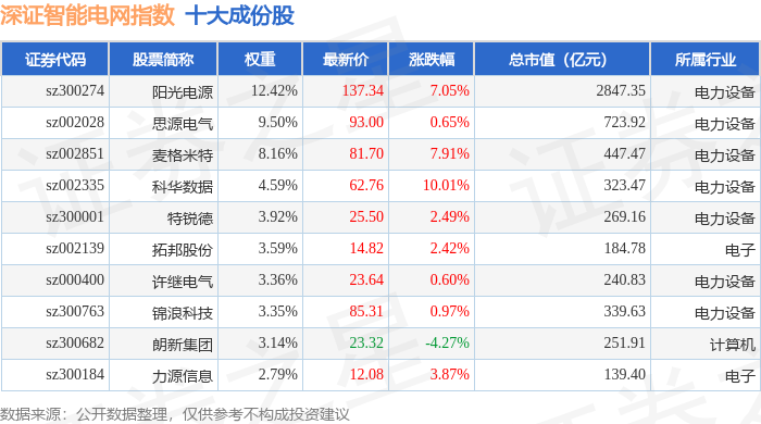 证券之星消息,9月11日,深证智能电网(970054)指数报收于3588.31点,涨3.74%,成交489.48亿元,换手率4.95%。当日该指数成份股中,上涨的有46家,科华数据以10.01%的涨幅领涨,下跌的有4家,朗新集团以4.27%的跌幅领跌。