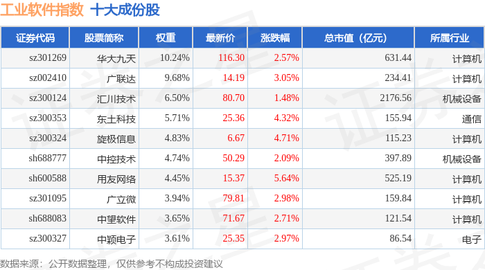 工业软件(980034)指数十大成份股详情如下: