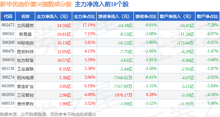 资金流向方面,新华优选价值50(989004)指数成份股当日主力资金净流入合计97.39亿元,游资资金净流出合计60.94亿元,散户资金净流出合计36.45亿元。成份股资金流向详情见下表: