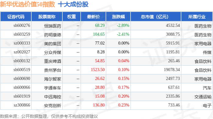 证券之星消息,9月11日,新华优选价值50(989004)指数报收于2146.74点,涨2.58%,成交3022.66亿元,换手率1.65%。当日该指数成份股中,上涨的有46家,胜宏科技以16.28%的涨幅领涨,下跌的有2家,恒瑞医药以2.89%的跌幅领跌。