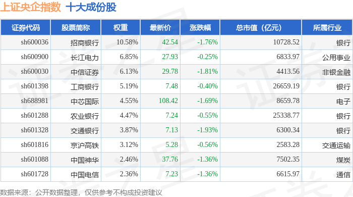 上证央企(000042)指数十大成份股详情如下: