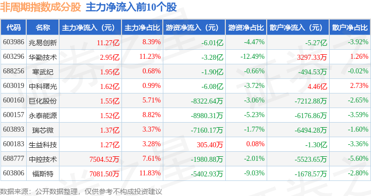 资金流向方面,非周期(000064)指数成份股当日主力资金净流出合计75.16亿元,游资资金净流入合计31.69亿元,散户资金净流入合计43.46亿元。成份股资金流向详情见下表: