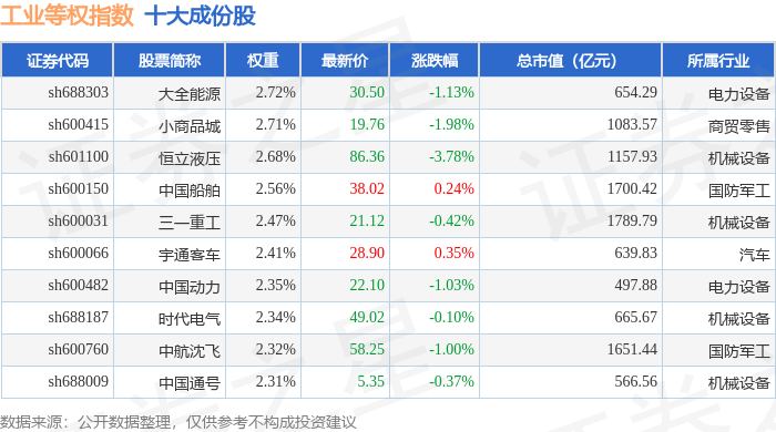 证券之星消息,9月12日,工业等权(000072)指数报收于2908.67点,跌0.37%,成交399.5亿元,换手率0.82%。当日该指数成份股中,上涨的有18家,招商轮船以3.46%的涨幅领涨,下跌的有29家,恒立液压以3.78%的跌幅领跌。