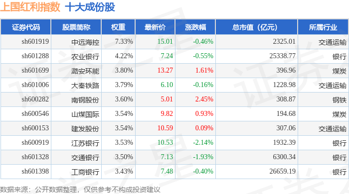 证券之星消息,9月12日,上国红利(000151)指数报收于1524.33点,跌0.38%,成交231.75亿元,换手率0.25%。当日该指数成份股中,上涨的有11家,南钢股份以2.45%的涨幅领涨,下跌的有18家,江苏银行以2.14%的跌幅领跌。