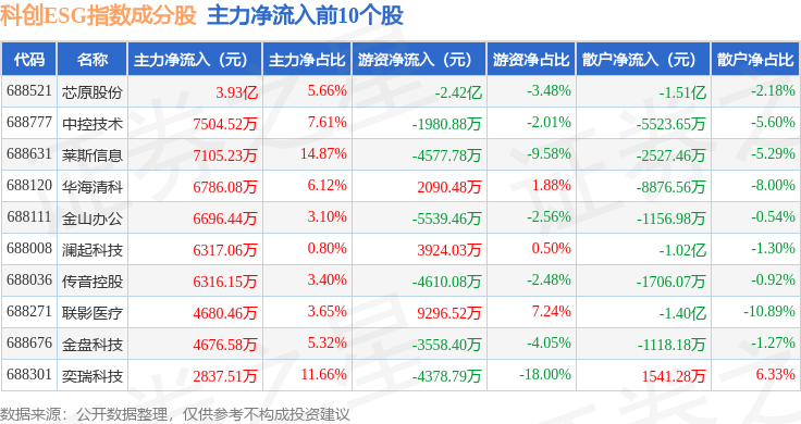 资金流向方面,科创ESG(000691)指数成份股当日主力资金净流出合计8.16亿元,游资资金净流入合计13.07亿元,散户资金净流出合计4.91亿元。成份股资金流向详情见下表: