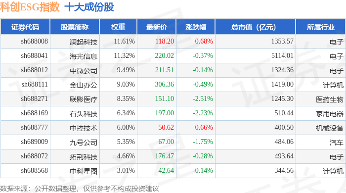 证券之星消息,9月12日,科创ESG(000691)指数报收于1382.06点,跌0.51%,成交662.82亿元,换手率1.86%。当日该指数成份股中,上涨的有12家,芯原股份以20.0%的涨幅领涨,下跌的有37家,传音控股以7.49%的跌幅领跌。