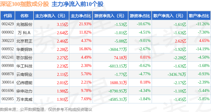 资金流向方面,深证300(399007)指数成份股当日主力资金净流出合计217.62亿元,游资资金净流入合计58.3亿元,散户资金净流入合计159.32亿元。成份股资金流向详情见下表: