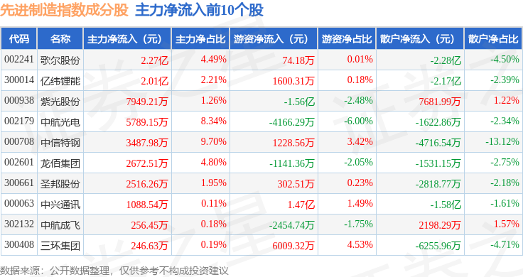 资金流向方面,先进制造(399260)指数成份股当日主力资金净流出合计106.98亿元,游资资金净流入合计45.2亿元,散户资金净流入合计61.78亿元。成份股资金流向详情见下表: