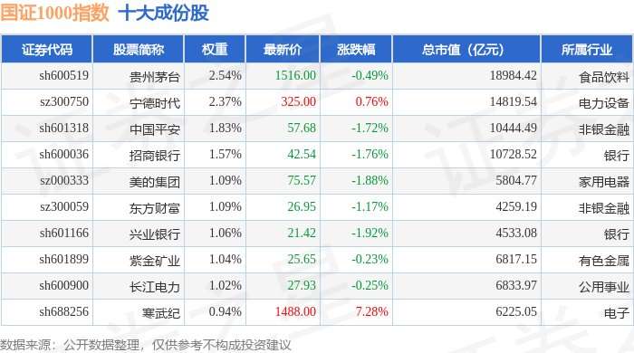国证1000(399311)指数十大成份股详情如下: