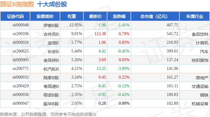 国证B指(399318)指数十大成份股详情如下: