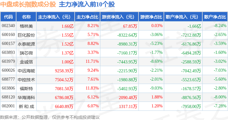 资金流向方面,中盘成长(399374)指数成份股当日主力资金净流出合计15.07亿元,游资资金净流入合计6.84亿元,散户资金净流入合计8.23亿元。成份股资金流向详情见下表: