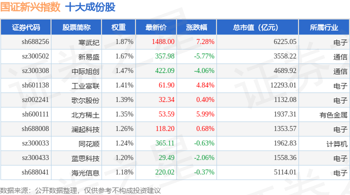 证券之星消息,9月12日,国证新兴(399392)指数报收于2949.65点,跌0.16%,成交4359.57亿元,换手率1.45%。当日该指数成份股中,上涨的有31家,寒武纪以7.28%的涨幅领涨,下跌的有69家,传音控股以7.49%的跌幅领跌。