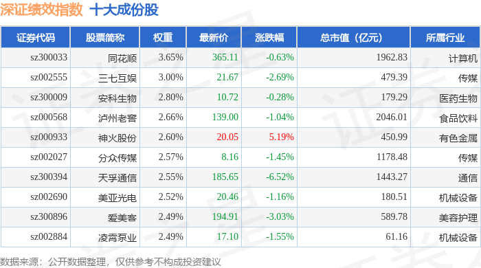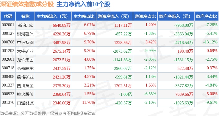 资金流向方面,深证绩效(399655)指数成份股当日主力资金净流出合计42.29亿元,游资资金净流入合计15.85亿元,散户资金净流入合计26.44亿元。成份股资金流向详情见下表: