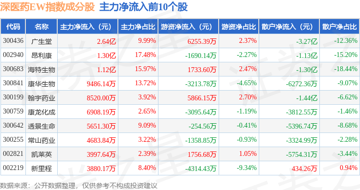 资金流向方面,深医药EW(399676)指数成份股当日主力资金净流出合计2.25亿元,游资资金净流入合计2.89亿元,散户资金净流出合计6406.81万元。成份股资金流向详情见下表: