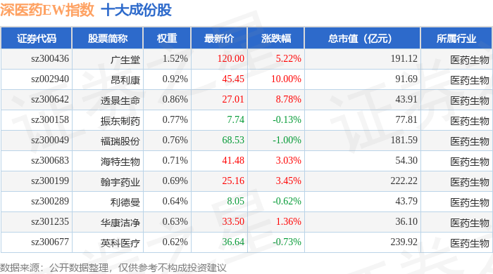 深医药EW(399676)指数十大成份股详情如下: