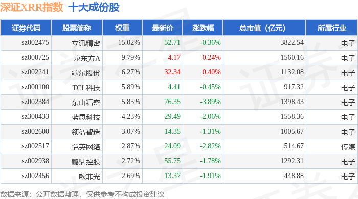 证券之星消息,9月12日,深证XRR(470046)指数报收于2425.81点,跌0.89%,成交998.27亿元,换手率3.6%。当日该指数成份股中,上涨的有12家,兆威机电以4.28%的涨幅领涨,下跌的有38家,中文在线以4.7%的跌幅领跌。