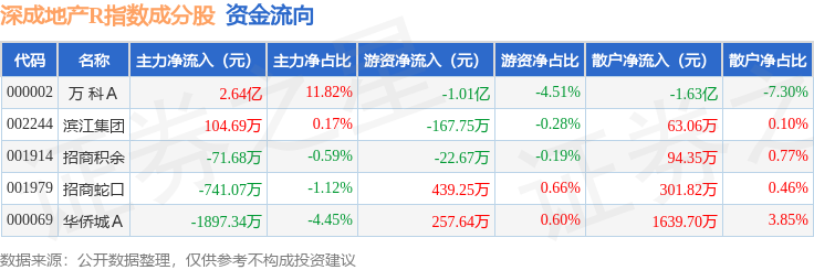 资金流向方面,深成地产R(471001)指数成份股当日主力资金净流入合计2.38亿元,游资资金净流出合计9577.41万元,散户资金净流出合计1.42亿元。成份股资金流向详情见下表: