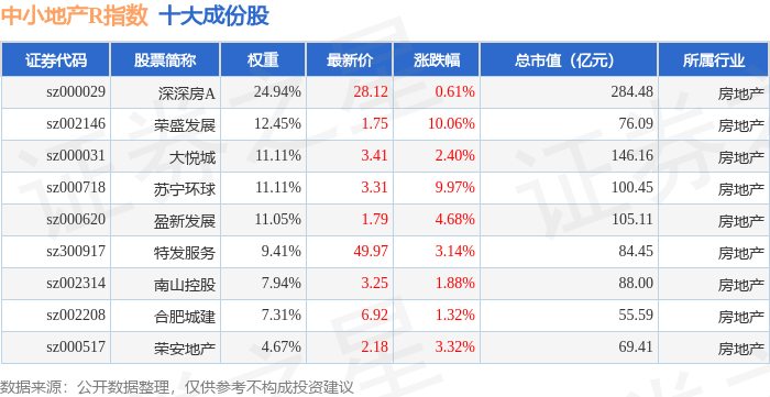 证券之星消息,9月12日,中小地产R(471002)指数报收于1830.58点,涨4.28%,成交33.21亿元,换手率4.72%。当日该指数成份股中,上涨的有9家,荣盛发展以10.06%的涨幅领涨。
