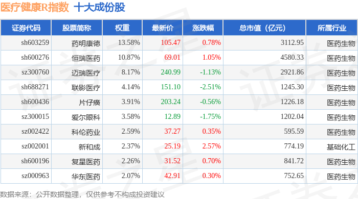 资金流向方面,医疗健康R(480016)指数成份股当日主力资金净流出合计11.02亿元,游资资金净流入合计5.83亿元,散户资金净流入合计5.19亿元。成份股资金流向详情见下表: