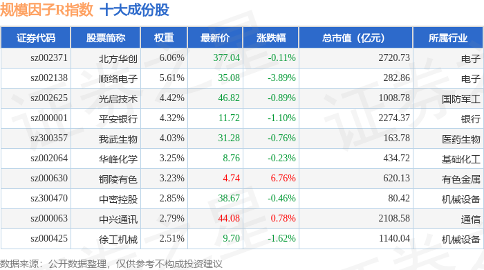证券之星消息,9月12日,规模因子R(480055)指数报收于2279.19点,跌0.17%,成交712.78亿元,换手率2.13%。当日该指数成份股中,上涨的有14家,铜陵有色以6.76%的涨幅领涨,下跌的有35家,顺络电子以3.89%的跌幅领跌。