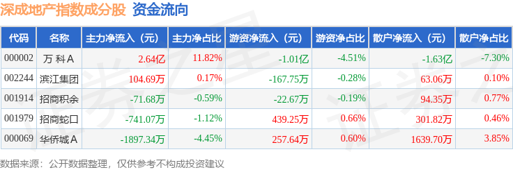 资金流向方面,深成地产(971001)指数成份股当日主力资金净流入合计2.38亿元,游资资金净流出合计9577.41万元,散户资金净流出合计1.42亿元。成份股资金流向详情见下表: