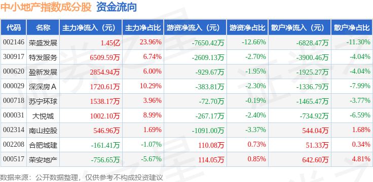 资金流向方面,中小地产(971002)指数成份股当日主力资金净流入合计2.77亿元,游资资金净流出合计1.28亿元,散户资金净流出合计1.5亿元。成份股资金流向详情见下表: