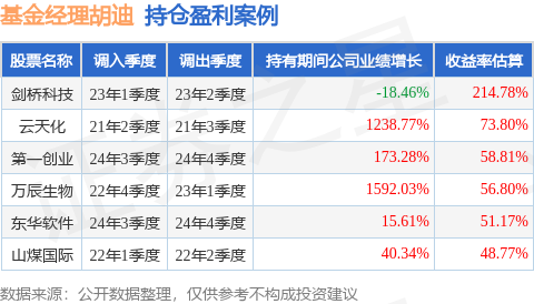 胡迪管理的摩根动态多因子混合A基金在23年1季度买入剑桥科技,在持有1个季度后在23年2季度卖出。持有期间的估算收益率为214.78%,持有期间剑桥科技在2022年到2023年的年报营业总收入降幅为18.46%。