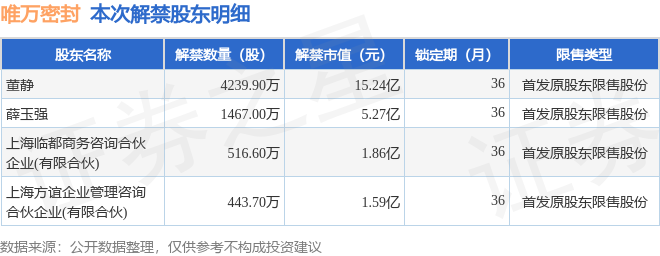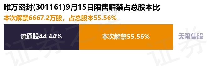证券之星消息,根据市场公开信息整理,唯万密封(301161)于9月15日将有6667.2万股限售股份解禁,为公司首发原股东限售股份,占公司总股本55.56%。(本次数据根据历史公告整理得出,实际情况以上市公司最新公告为准)本次解禁后,公司已无限售股份。具体如下图所示: