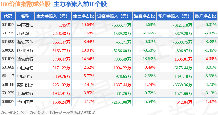 资金流向方面,180价值(000029)指数成份股当日主力资金净流出合计69.01亿元,游资资金净流入合计25.55亿元,散户资金净流入合计43.46亿元。成份股资金流向详情见下表: