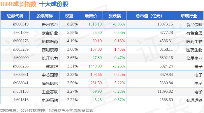 180R成长(000030)指数十大成份股详情如下: