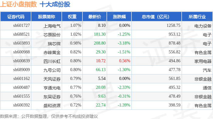 证券之星消息,9月15日,上证小盘(000045)指数报收于5576.99点,跌0.23%,成交2548.82亿元,换手率2.16%。当日该指数成份股中,上涨的有95家,纳芯微以10.79%的涨幅领涨,下跌的有211家,晶科科技以5.66%的跌幅领跌。