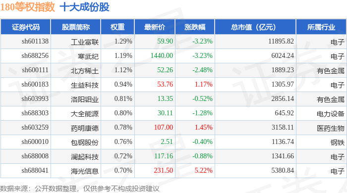 证券之星消息,9月15日,180等权(000051)指数报收于9122.51点,涨0.0%,成交3129.53亿元,换手率0.54%。当日该指数成份股中,上涨的有60家,拓荆科技以7.55%的涨幅领涨,下跌的有110家,华勤技术以5.0%的跌幅领跌。