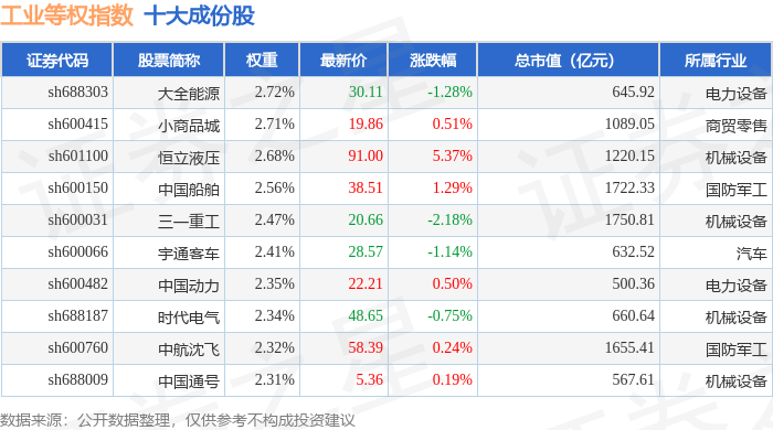 工业等权(000072)指数十大成份股详情如下: