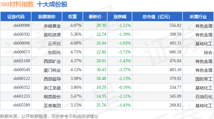 380材料(000105)指数十大成份股详情如下: