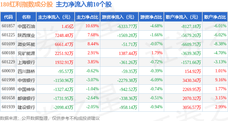 资金流向方面,180红利(000149)指数成份股当日主力资金净流出合计42.46亿元,游资资金净流入合计16.34亿元,散户资金净流入合计26.13亿元。成份股资金流向详情见下表: