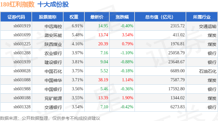 证券之星消息,9月15日,180红利(000149)指数报收于3987.62点,跌0.1%,成交388.3亿元,换手率0.28%。当日该指数成份股中,上涨的有5家,潞安环能以3.54%的涨幅领涨,下跌的有22家,兴业银行以1.63%的跌幅领跌。