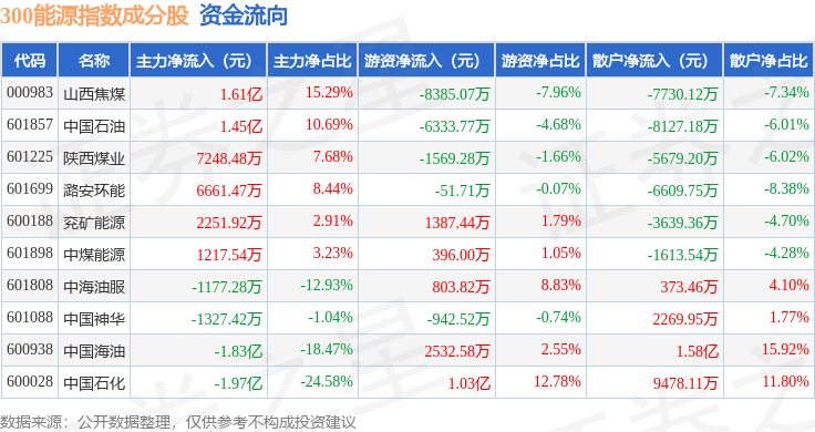 资金流向方面,300能源(000908)指数成份股当日主力资金净流入合计7383.17万元,游资资金净流出合计1904.94万元,散户资金净流出合计5478.24万元。成份股资金流向详情见下表: