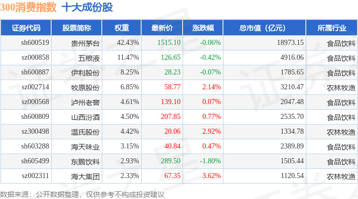 证券之星消息,9月15日,300消费(000912)指数报收于23300.0点,涨0.27%,成交204.64亿元,换手率0.89%。当日该指数成份股中,上涨的有8家,海大集团以3.62%的涨幅领涨,下跌的有9家,东鹏饮料以1.8%的跌幅领跌。